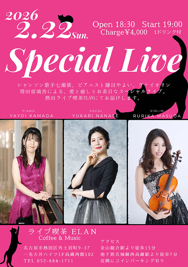 シャンソン歌手 七瀬紫、ピアニスト 鎌田やよい、ヴァイオリン 増田留璃香による、愛と癒しとお茶目なスペシャルライブ。ライブ喫茶ELANにてお届けします。